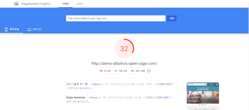 表示速度の計測については、グーグルが開発者向けに提供している「PageSpeed Insights」というサービスを利用しました。URLを入れてポチるだけの無料ツールなので、サイトの健康診断だと思って気軽にチェックしてみてください。100点満点で計測されます。モバイル・PCを1回でチェックすることができるスグレモノ。表示速度を速くするための改善案も出してくれます。