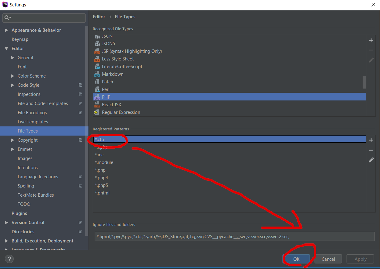 [Editor]-[FileTypes]をクリックし、「Recognized File Types」の中から「PHP」を選択。